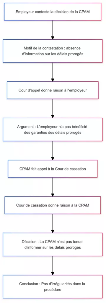 Mais la Cour de cassation a finalement donné raison à la CPAM. Elle a jugé que la Caisse n’était pas tenue d’informer l’employeur de ces règles, et que la procédure d’instruction n’avait donc pas été entachée d’irrégularités. La CPAM n’avait donc enfreint aucune loi, car la réglementation n’impose pas d’informer sur les délais, qu’ils soient prorogés ou non.