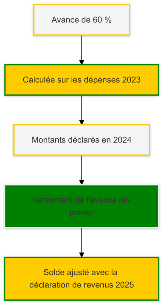En janvier 2025, une avance de 60 % des crédits et réductions d’impôt calculée sur vos dépenses de 2023 sera versée automatiquement. Cette avance vise à alléger vos charges dès le début de l’année.