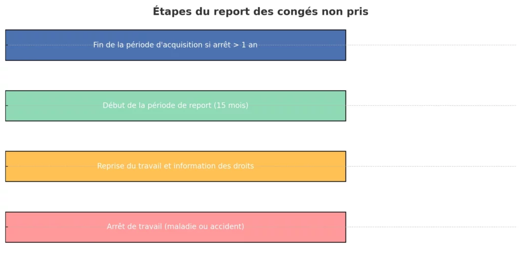 Si l’arrêt de travail est dû à une maladie professionnelle ou un accident du travail, le salarié bénéficie des mêmes règles de report. Cependant, des conventions spécifiques peuvent prévoir des délais plus longs.
