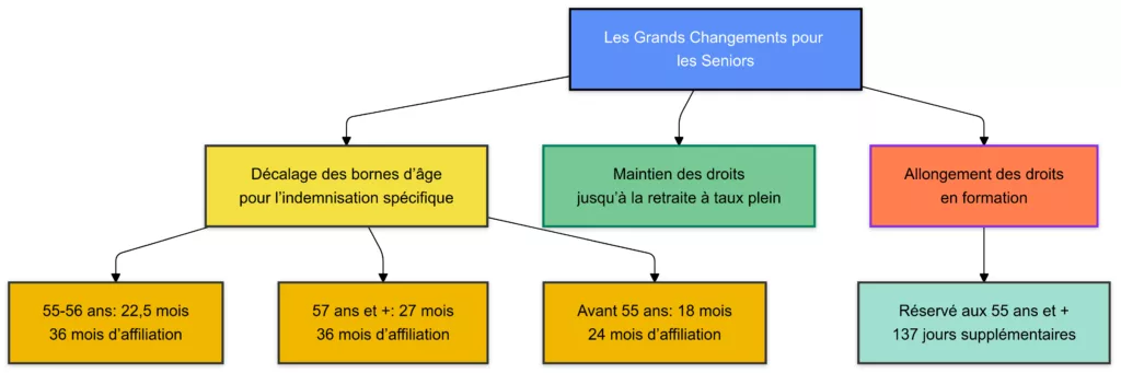 Actuellement, les seniors peuvent accéder à des durées d’indemnisation plus longues dès 53 ans. Avec l’avenant, ces seuils sont repoussés à 55 ans pour s’aligner sur le report de l’âge légal de la retraite.