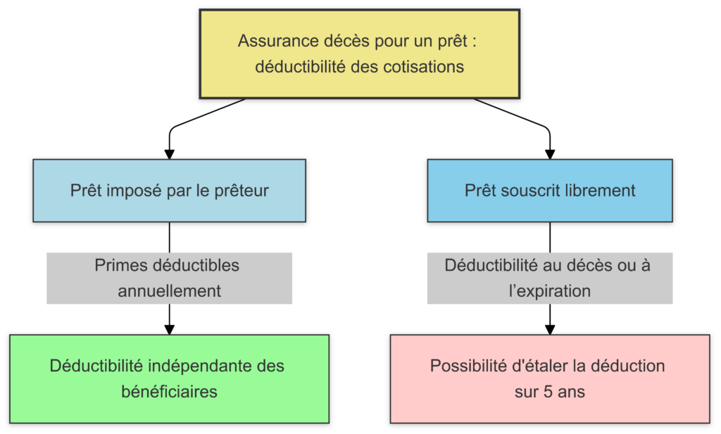 | Assurance décès pour prêt obligatoire | Garantir le remboursement d’un emprunt | Déductible au fil des échéances si imposée par le prêteur |