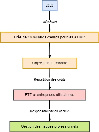 Pour mieux saisir l’ampleur de l’impact financier des AT/MP, il est important de noter qu’en 2023, les accidents du travail et les maladies professionnelles ont coûté environ 10 milliards d’euros au système de sécurité sociale en France. La réforme vise à répartir cette charge financière de manière plus équitable entre les entreprises de travail temporaire (ETT) et les entreprises utilisatrices. L’objectif est de responsabiliser davantage chaque partie face aux risques professionnels.