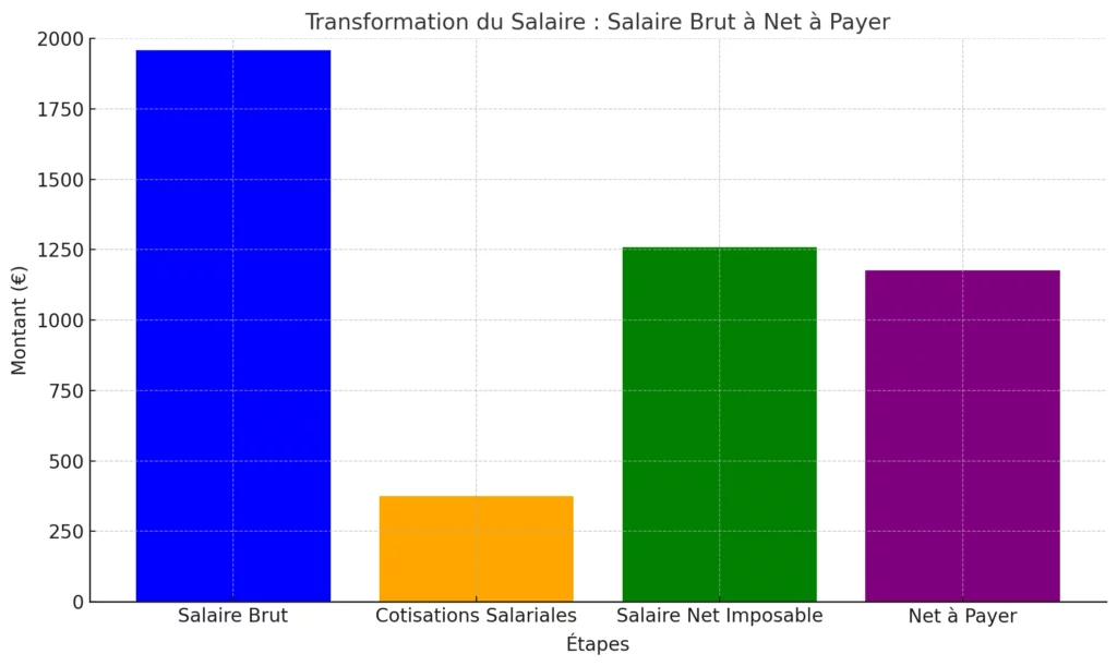 Après déduction des cotisations salariales, votre salaire brut se transforme en salaire net imposable, puis en net à payer, qui correspond à la somme que vous recevez réellement.