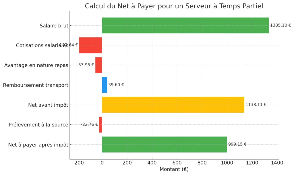 Le net à payer, c’est ce que le salarié reçoit sur son compte après les déductions. Voici les étapes pour un serveur à temps partiel :