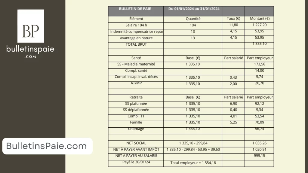 | Avantage en nature repas | 13 repas × 4,15 | 53,95 |