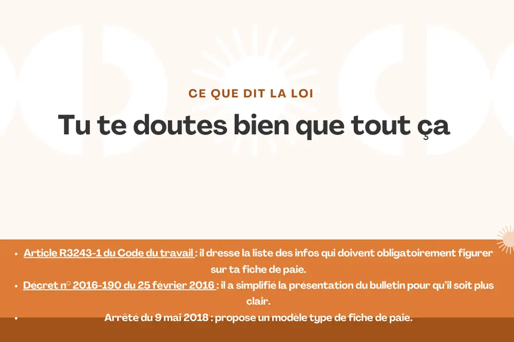 - Article R3243-1 du Code du travail : il dresse la liste des infos qui doivent obligatoirement figurer sur ta fiche de paie.