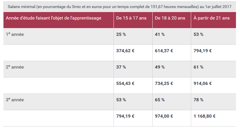 Pour sa première année d’apprentissage à l’apprenti âgé de 15 ans à 17 ans perçoit un salaire minimal de 25 % du SMIC soit 374,62 euros. Pour sa deuxième année, 37 % du SMIC soit 554,43 euros. L’apprenti pour sa troisième année passe à 53 % du SMIC soit en 2018 le montant de 794 , 19€.