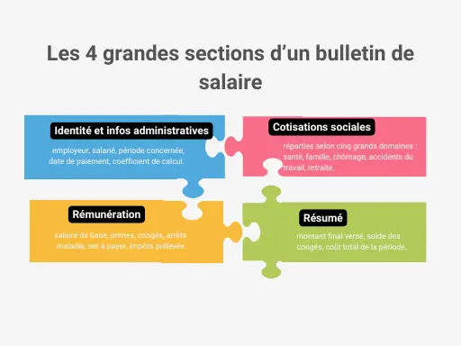 1. Identité et infos administratives : employeur, salarié, période concernée, date de paiement, coefficient de calcul.