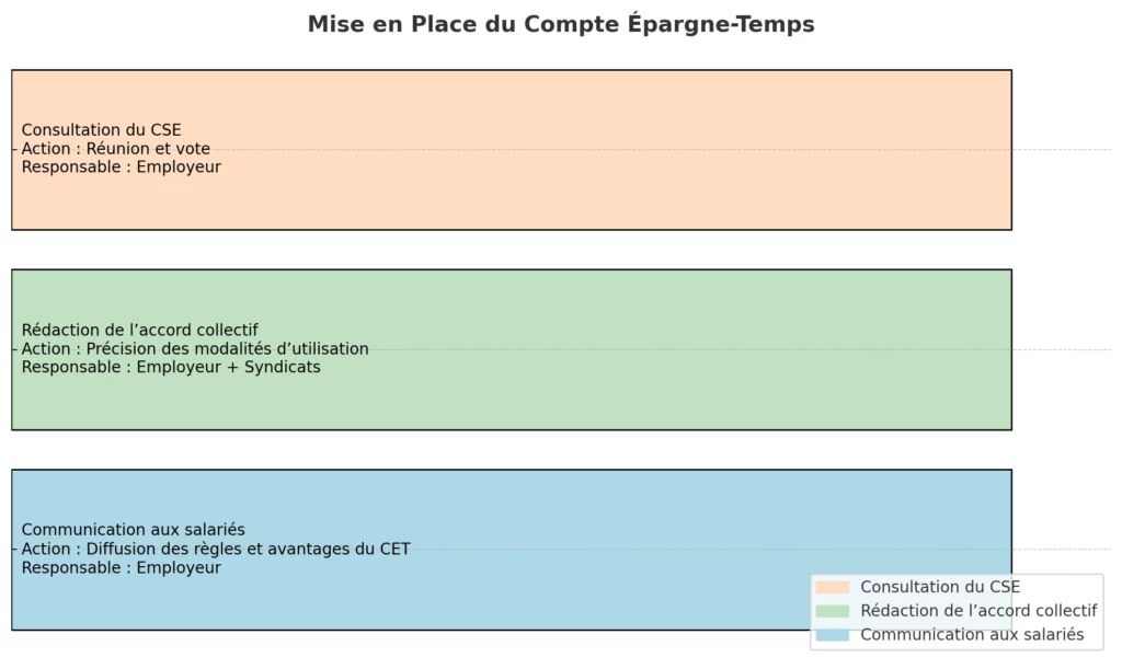- Sans accord : L’employeur peut instaurer unilatéralement un CET, à condition de respecter les dispositions du Code du travail.