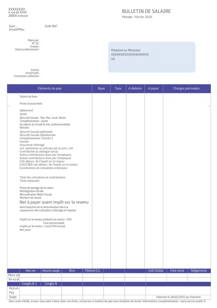 Les cotisations sociales doivent être cohérentes avec les taux en vigueur. Cela concerne aussi bien la part que vous payez (salariale) que celle prise en charge par votre employeur. Le prélèvement à la source, lui aussi, doit être affiché clairement, avec le bon taux et le bon montant.