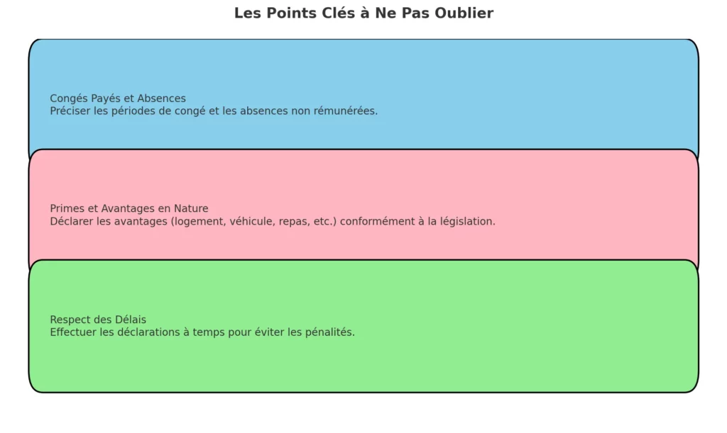 - Primes et Avantages en Nature : Tous les avantages (logement, véhicule, repas, etc.) doivent être déclarés pour être conformes à la législation.