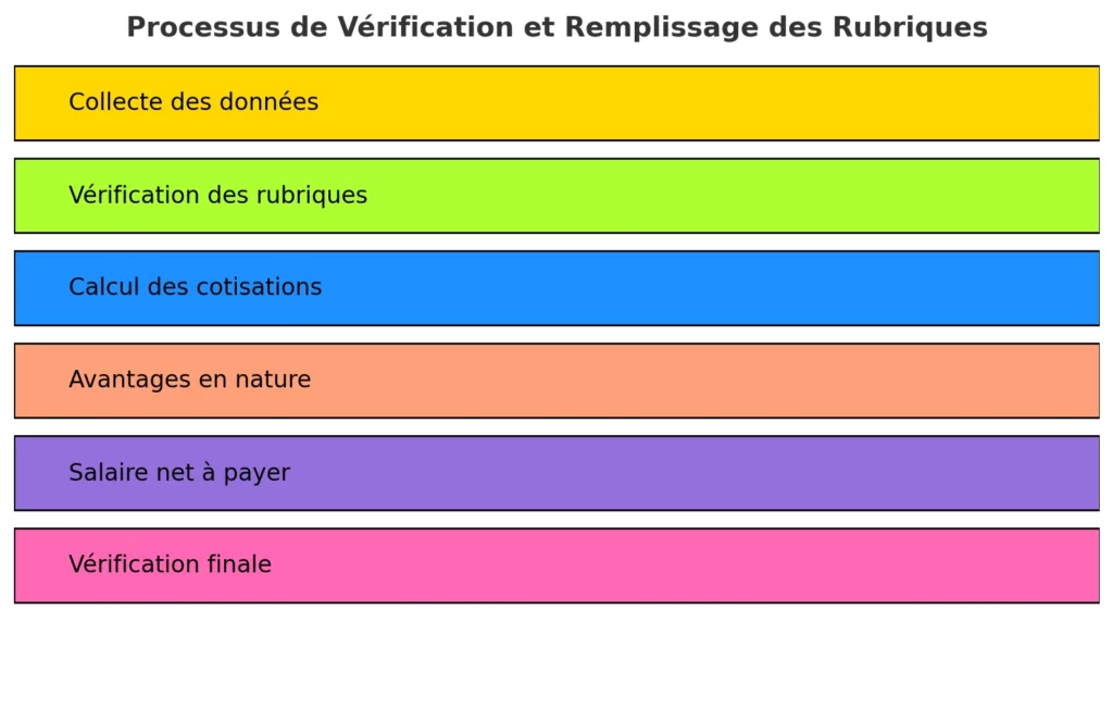 Une fois les données collectées, l’étape suivante consiste à remplir les rubriques obligatoires des bulletins de paie. Parmi elles :