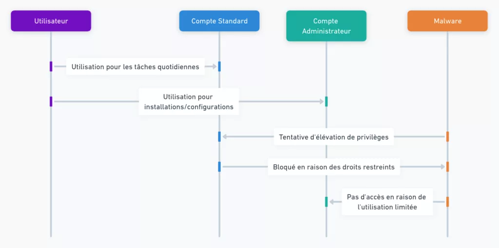 Utiliser un compte administrateur au quotidien augmente les risques. Les cybercriminels peuvent exploiter ces droits pour infliger plus de dégâts.