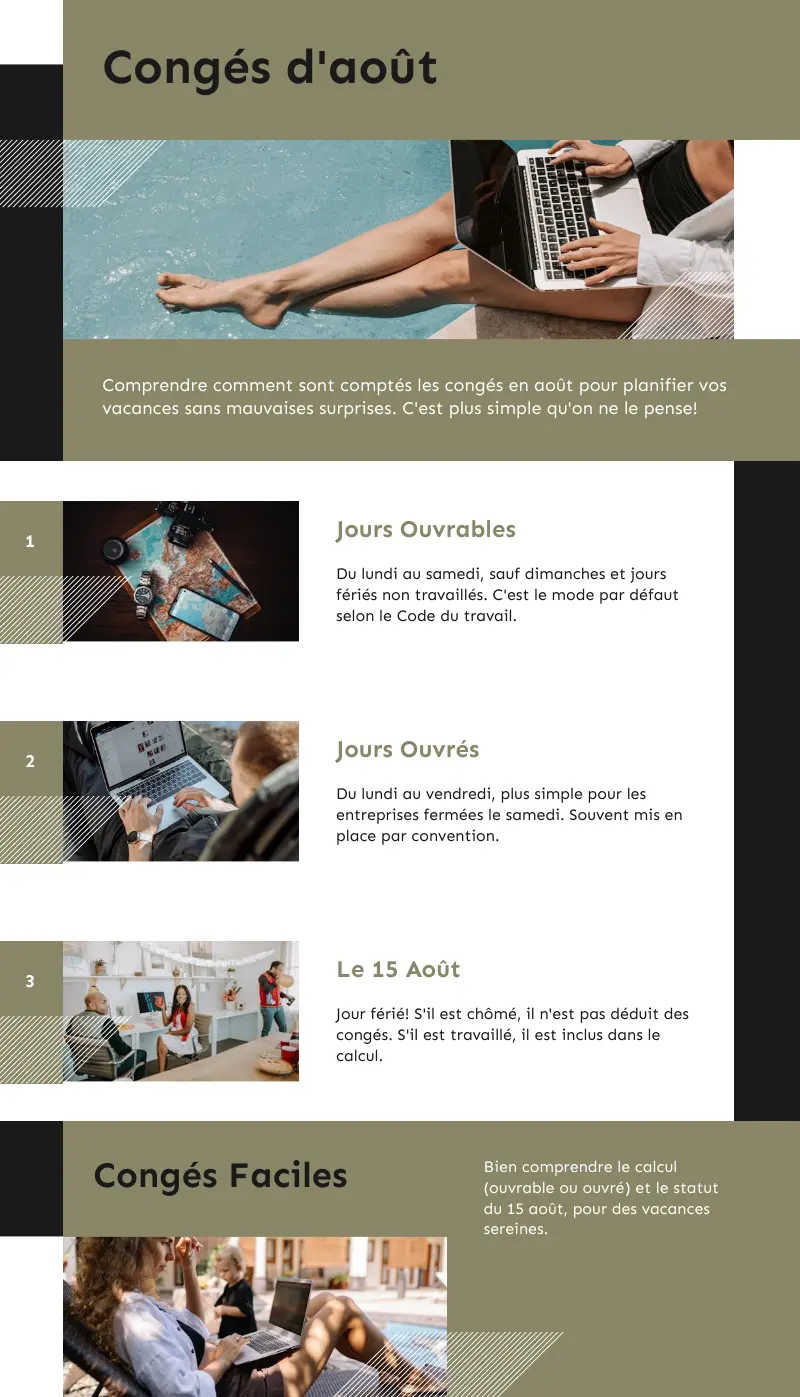 Le mois d’août est traditionnellement celui des congés d’été en France. Mais entre jours ouvrables, jours ouvrés, et jours fériés comme le 15 août, comment les congés payés sont-ils réellement comptabilisés ? Voici un guide clair pour comprendre vos droits et bien planifier vos vacances estivales. Comment sont comptés les congés payés en août ?