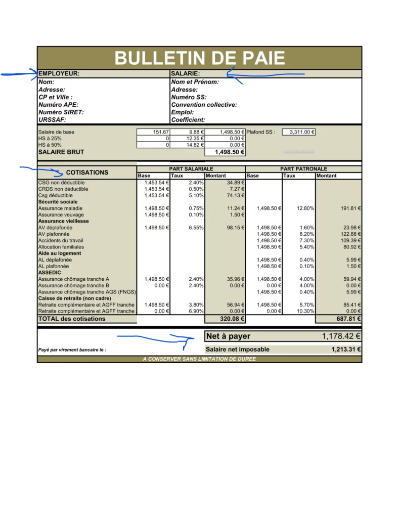 - Cotisations salariales : assurance maladie, retraite, chômage, CSG/CRDS