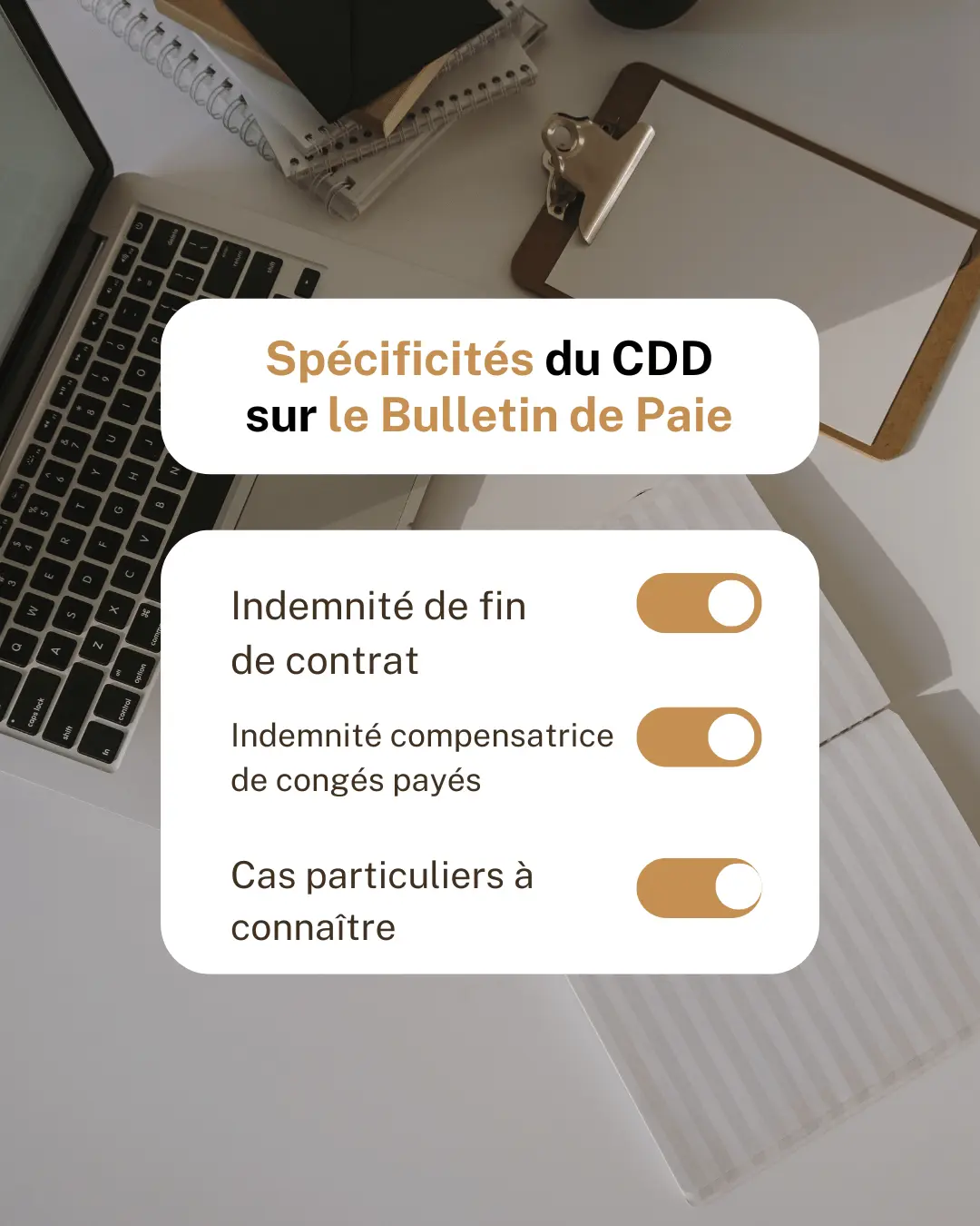 Ce bulletin met en évidence les deux spécificités principales du CDD (indemnités), qui ne sont pas présentes sur un bulletin de paie en CDI. Les taux sont approximatifs à des fins pédagogiques.