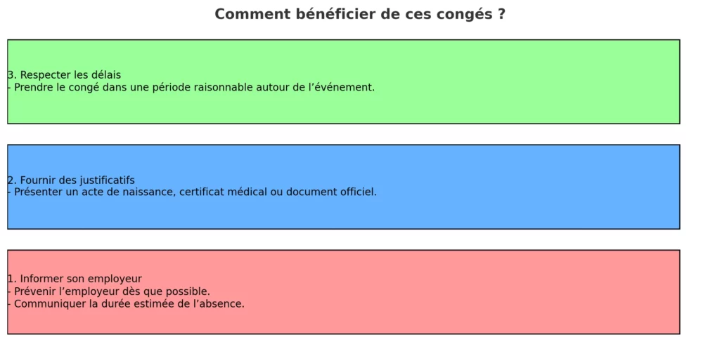 • Les congés doivent être pris dans une période raisonnable autour de l’événement, sauf exceptions comme la naissance où le choix du jour est flexible.