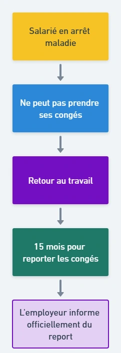 - Si ton arrêt maladie dure longtemps (un an ou plus), le report des congés commence à la fin de la période d’acquisition, et tu as jusqu’à 15 mois pour les utiliser.