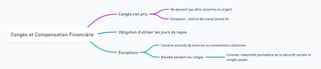 Un point crucial de la loi : les congés ne peuvent pas être convertis en argent. C’est-à-dire que si tu as des jours de congés non pris, tu ne peux pas demander à ton employeur de te les payer, sauf si ton contrat de travail prend fin. En clair, tu dois utiliser tes jours de repos, car il est impossible de les échanger contre une compensation financière.