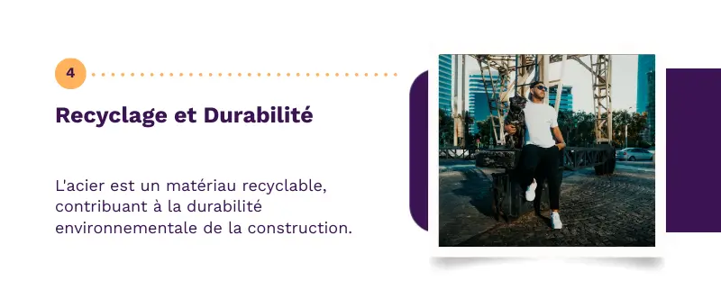 L’acier est une ressource durable, puisqu’il peut être recyclé indéfiniment sans altération de ses propriétés. Contrairement au béton, qui produit des déchets complexes à revaloriser, l’acier peut être refondu et réutilisé dans de nouveaux projets. Cette capacité en fait un choix respectueux de l’environnement, favorisant une approche plus responsable de la construction et contribuant à la réduction de l’empreinte carbone.