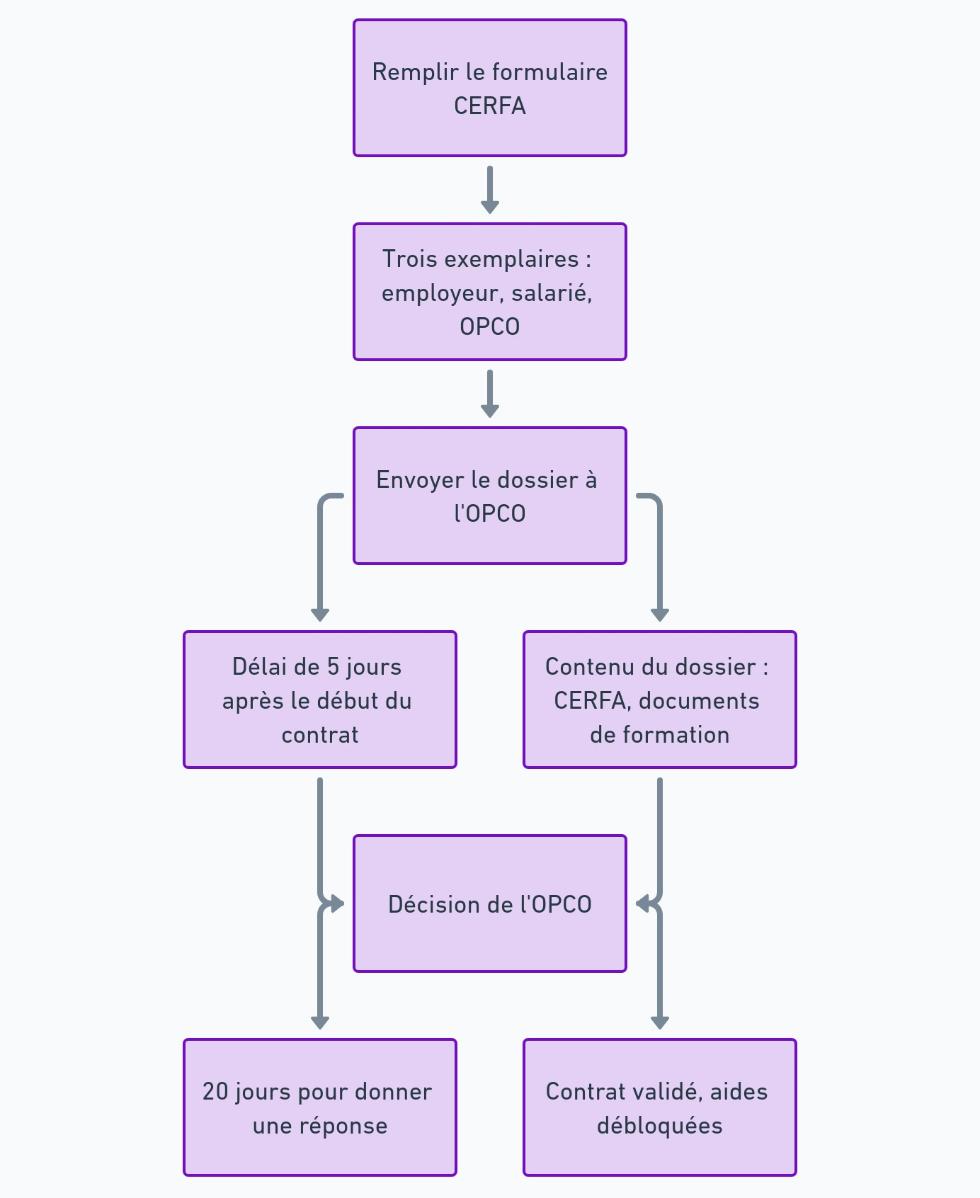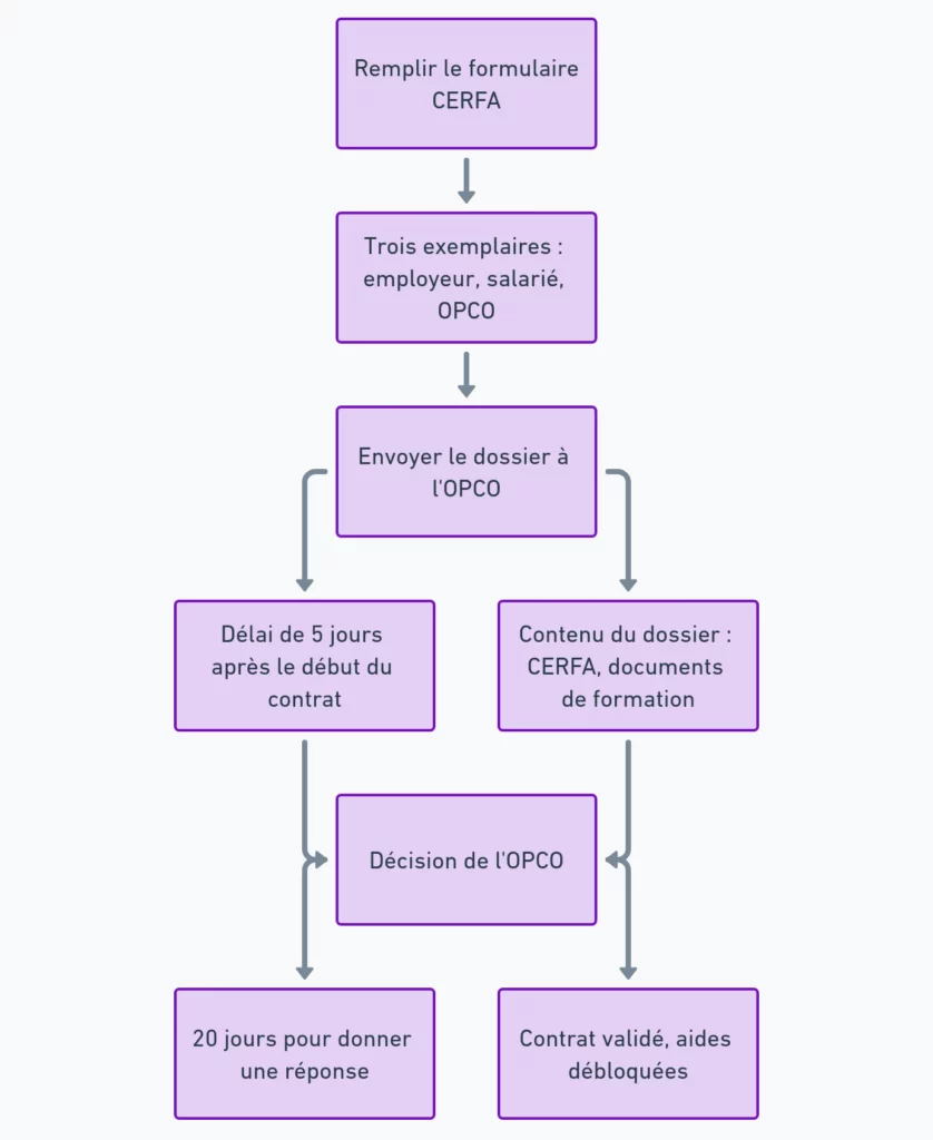 L’employeur doit remplir le formulaire CERFA en trois exemplaires : un pour l’employeur, un pour le salarié, et un pour l’OPCO (Opérateur de Compétences).