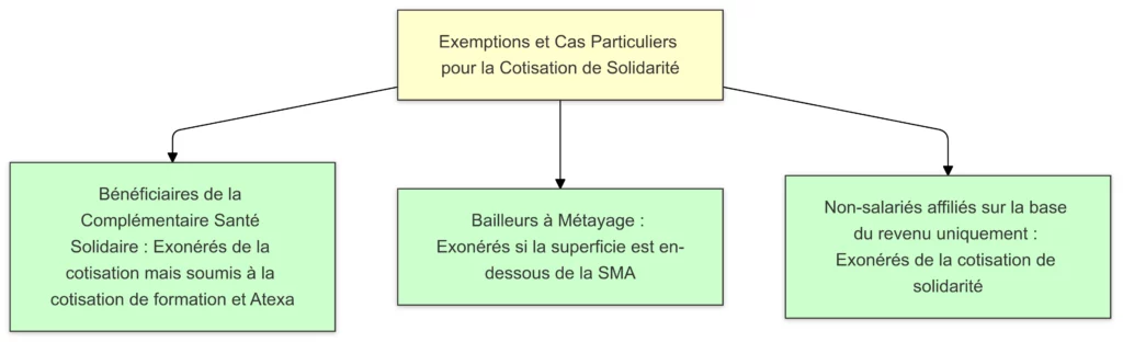 Cette cotisation de solidarité est déduite pour certains exploitants. Les bénéficiaires de la complémentaire santé solidaire sont par exemple exemptés, bien qu’ils restent soumis aux cotisations de formation professionnelle continue et Atexa. De plus, les bailleurs à métayage ne sont pas redevables de la cotisation de solidarité, à condition que la superficie de leur exploitation soit en-dessous de la SMA.