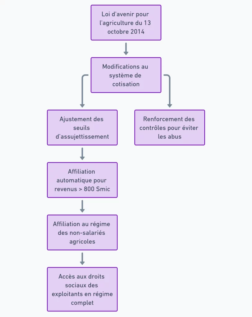 La loi d’avenir pour l’agriculture du 13 octobre 2014 a apporté des modifications notables au système de cotisation. Ces réformes ont ajusté les seuils d’assujettissement et ont renforcé les contrôles pour éviter les abus. Les cotisants qui dépassent le seuil de 800 Smic de revenus sont désormais affiliés automatiquement au régime des non-salariés agricoles, leur permettant d’accéder aux mêmes droits sociaux que les exploitants en régime complet.