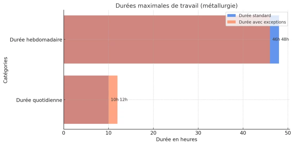 La durée hebdomadaire est fixée à 48 heures maximum, avec une moyenne de 44 heures sur une période de 12 semaines consécutives. Certaines activités spécifiques, comme le montage ou la maintenance, peuvent toutefois atteindre une moyenne de 46 heures.