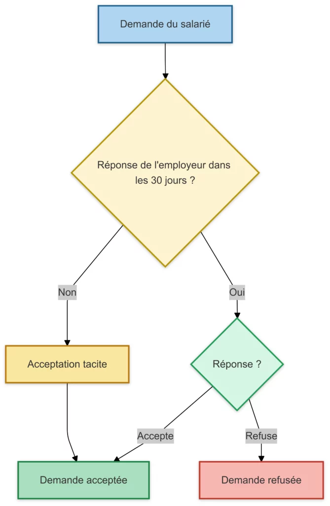 | Réponse de l’employeur | 30 jours max. | Silence = Accord tacite |