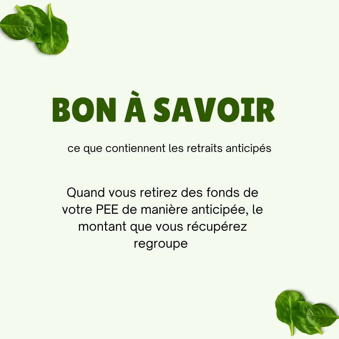 Quand vous retirez des fonds de votre PEE de manière anticipée, le montant que vous récupérez regroupe :