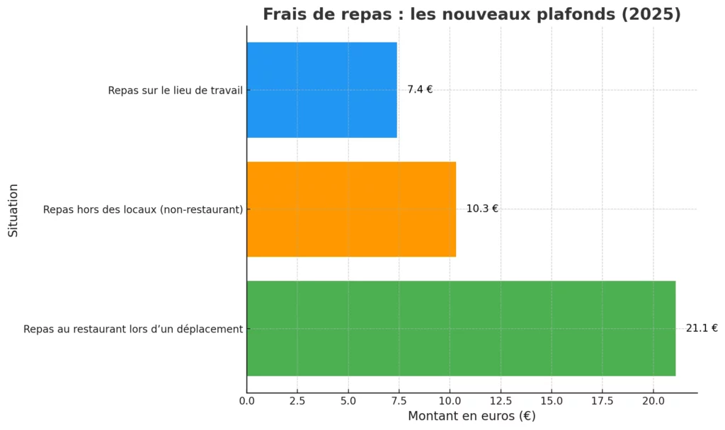 Les frais de repas concernent principalement les salariés en déplacement professionnel ou ceux travaillant en dehors des locaux habituels. Voici les montants applicables en 2025 :