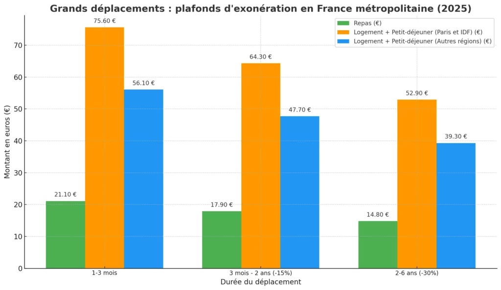 Les grands déplacements, qu’ils soient en France ou à l’étranger, impliquent des dépenses importantes. Les plafonds d’exonération varient selon la durée et la localisation. Voici un résumé pour les déplacements en France métropolitaine :