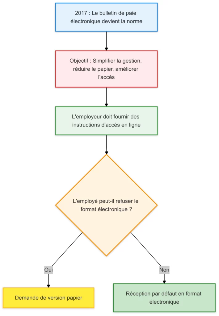 On en parlait, depuis 2017, le format électronique est devenu le mode par défaut pour la fiche de paie. Cette transition a pour but de simplifier la gestion des fiches de paie, de réduire le papier, et de faciliter l’accès aux documents en ligne. L’employeur doit quand même te donner des instructions claires sur comment accéder à tes fiches de paie en ligne. Bien sûr, tu as toujours le droit de refuser le format électronique et de demander une version papier.
