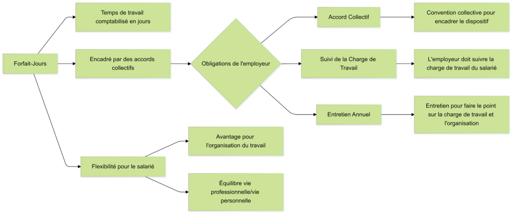Le forfait-jours est un système qui permet de comptabiliser le temps de travail en jours, plutôt qu’en heures. Cela signifie que le salarié peut travailler sur une plus grande flexibilité, souvent au bénéfice de l’organisation de son travail. Cependant, ce système doit être encadré par des accords collectifs qui garantissent un équilibre entre la vie professionnelle et la vie personnelle.