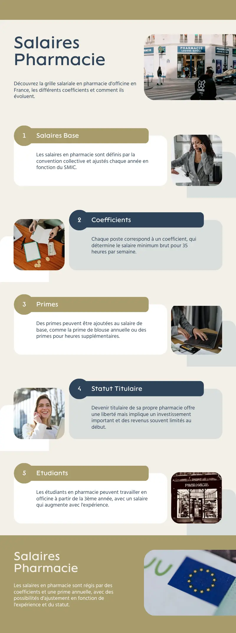 Les étudiants ont plusieurs occasions de travailler en officine, davantage à partir de la 3ᵉ année. Voici les niveaux de rémunération en fonction de leur expérience :