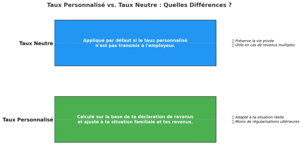 - Le taux neutre : Appliqué par défaut si tu choisis de ne pas transmettre ton taux personnalisé à ton employeur. Ce taux ne tient pas compte de ta situation personnelle.