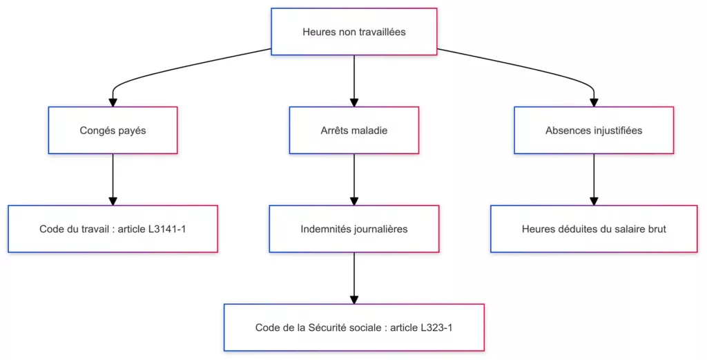 Les heures non travaillées regroupent toutes les situations où vous n’êtes pas au boulot mais que cela apparaît sur votre fiche de paie. Voici les cas les plus fréquents :