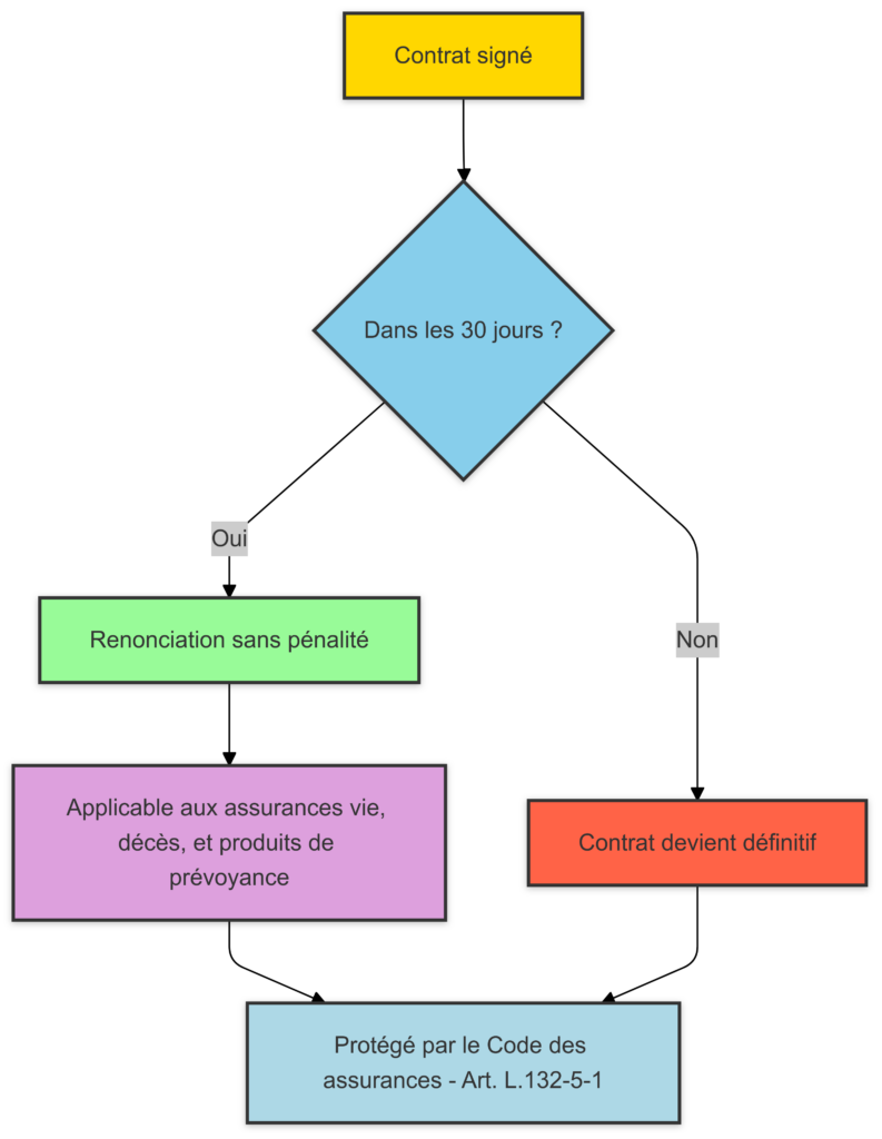Cette disposition est précisée dans le Code des assurances (article L.132-5-1) et vise à protéger les consommateurs contre les pressions commerciales ou les décisions impulsives, notamment lors de démarchages à domicile ou d’offres téléphoniques.