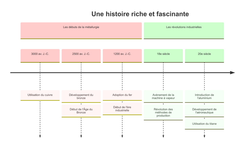 Tout a commencé il y a plus de 5000 ans avec l’utilisation du cuivre et du bronze. Ces matériaux ont marqué l’histoire, donnant leur nom à des périodes comme l’Âge du Bronze. Ensuite, le fer a pris le relais, ouvrant l’ère de l’industrialisation.