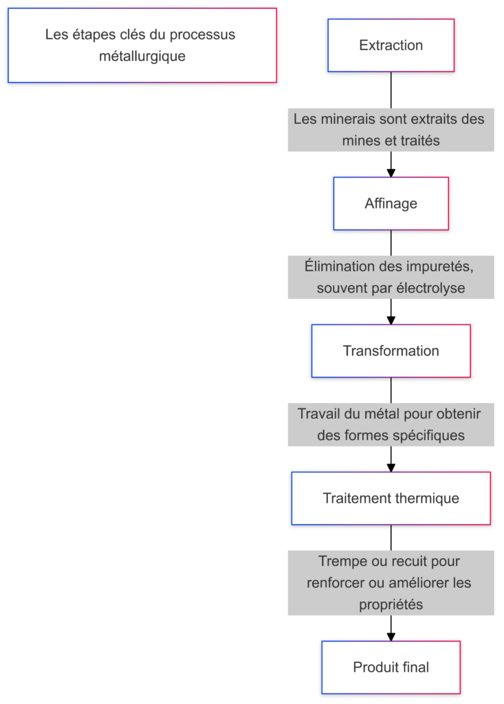 Les minerais sont extraits des mines, puis traités pour isoler le métal pur. Par exemple, le fer est extrait de la roche via des hauts fourneaux.