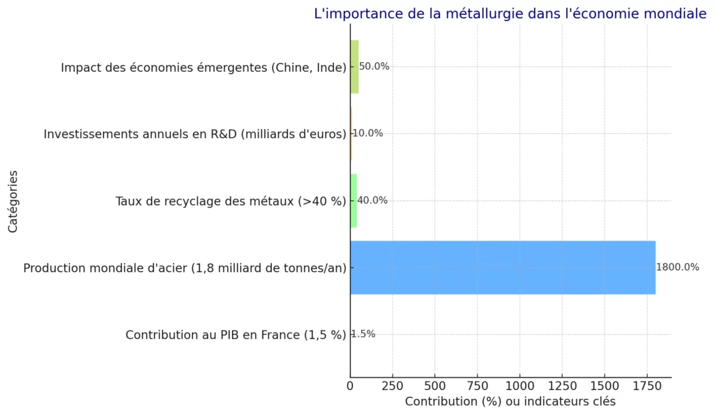 Le poids économique de la métallurgie est colossal. En France, elle représente environ 1,5 % du PIB, employant des centaines de milliers de personnes directement ou indirectement. À l’échelle mondiale, les métaux issus de la métallurgie sont omniprésents, des bâtiments aux objets technologiques.