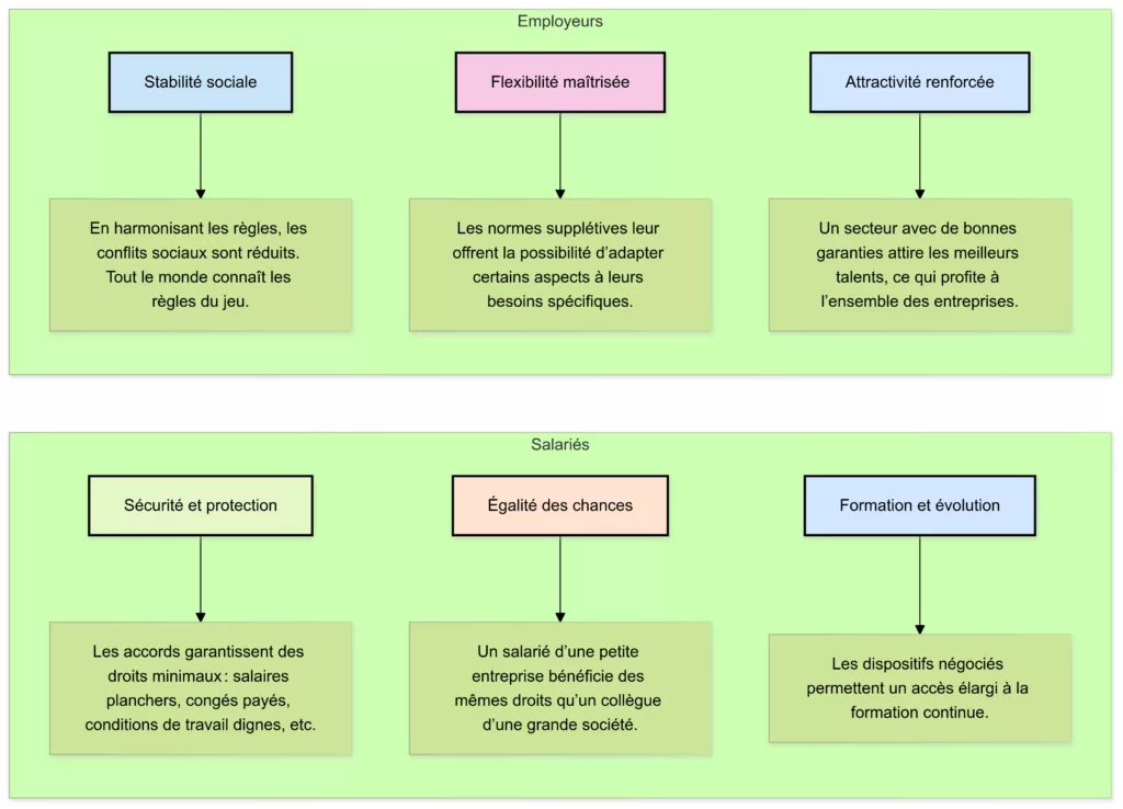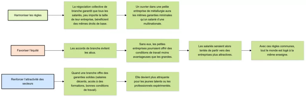 Les accords de branche évitent les abus. Sans eux, les petites entreprises pourraient offrir des conditions de travail moins avantageuses que les grandes. Les salariés seraient alors tentés de partir vers des entreprises plus attractives. Avec ces règles communes, tout le monde est logé à la même enseigne.
