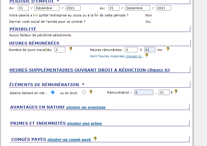 Simplement, remplissez les cases en question par 01 minute et 01 cents en cochant la case Salaire déclaré en net.