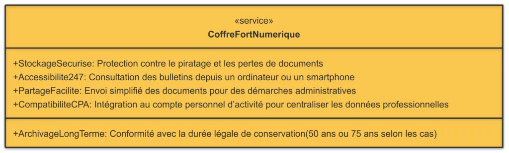 Le coffre-fort numérique est la pierre angulaire du système électronique. C’est une solution sécurisée pour héberger les bulletins de paie. Voici un tableau récapitulatif des fonctionnalités et avantages :