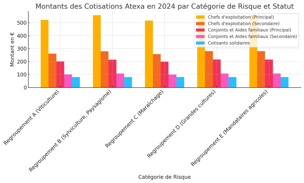Les cotisations au régime Atexa sont fixées chaque année par arrêté et dépendent de la catégorie de risque à laquelle appartient l’exploitation. Ces montants varient pour chaque statut de cotisant (chef d’exploitation, conjoint, cotisant solidaire, etc.) et selon la nature de l’activité agricole (viticulture, élevage, maraîchage, etc.).