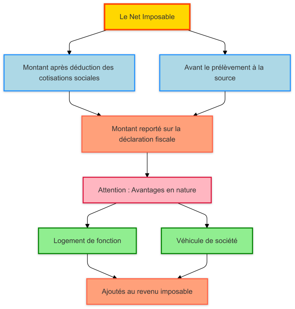 | Net imposable | Salaire brut moins les cotisations sociales avant prélèvement à la source. |