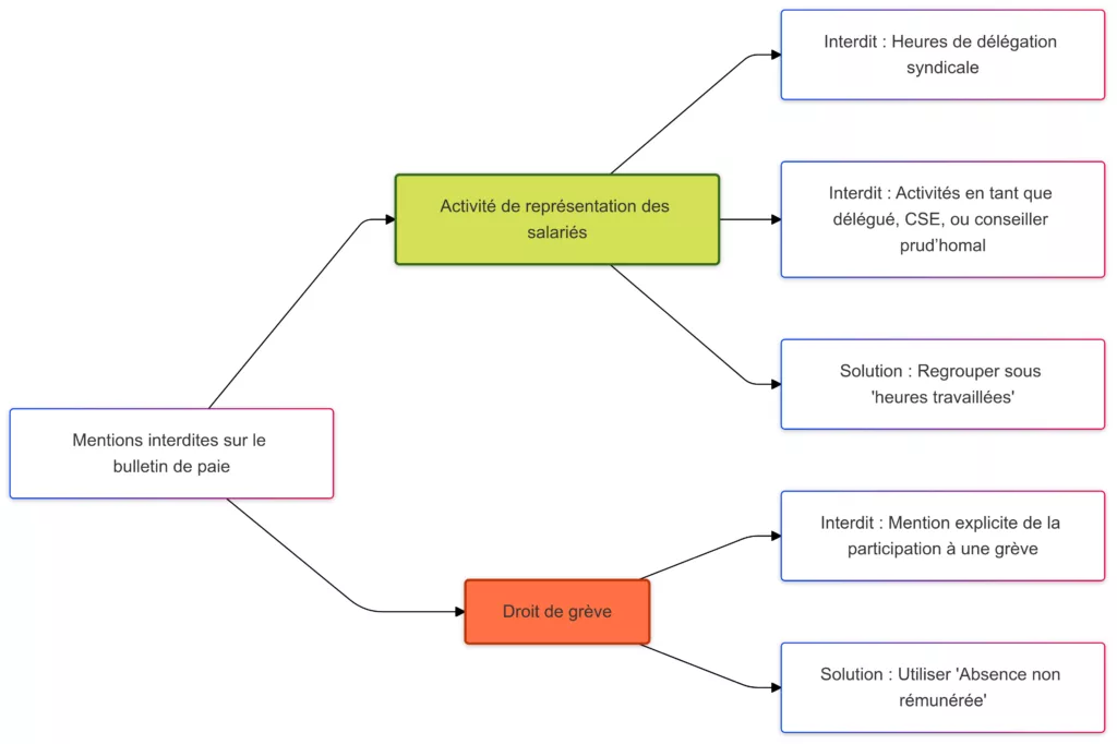 L’article R. 3243-4 du Code du travail interdit toute mention liée aux activités de représentation des salariés sur le bulletin de paie. Cela inclut :