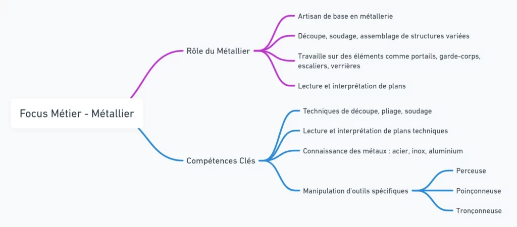| Métallier | Conçoit et fabrique des structures métalliques pour bâtiments et objets. | Découpe, soudure, lecture de plans |