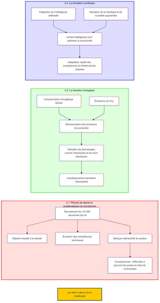 Cependant, la métallurgie fait face à des défis majeurs. Entre le besoin de renouveler sa main-d’œuvre, l’urgence écologique et la pression de la concurrence internationale, elle doit constamment évoluer pour rester compétitive. Mais cette transformation est aussi une formidable opportunité. La révolution numérique, la décarbonation des procédés, et l’émergence de nouveaux métiers rendent le secteur plus dynamique que jamais.