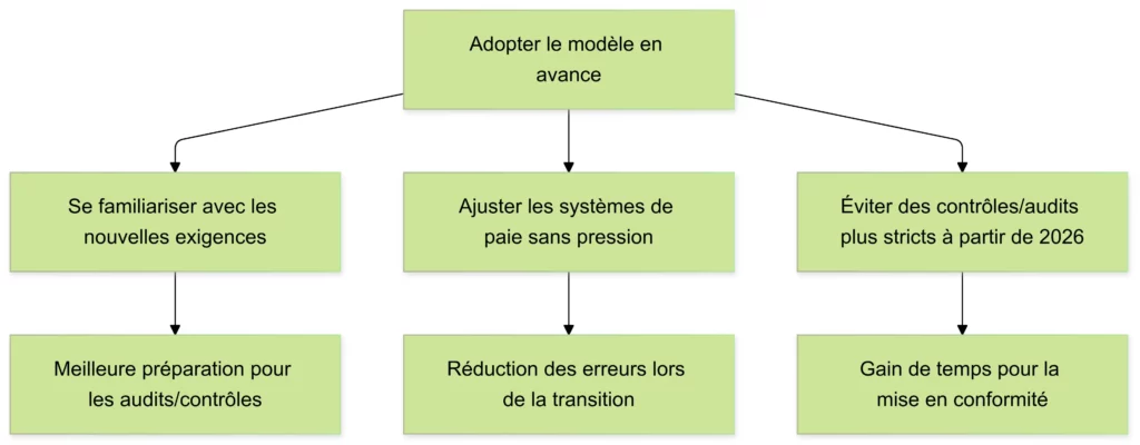 | Transition en douceur | Adopter le modèle maintenant permet une mise à jour progressive des systèmes de paie. |